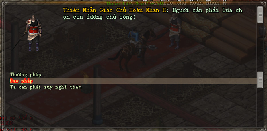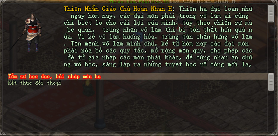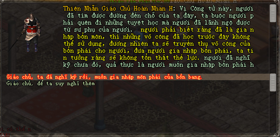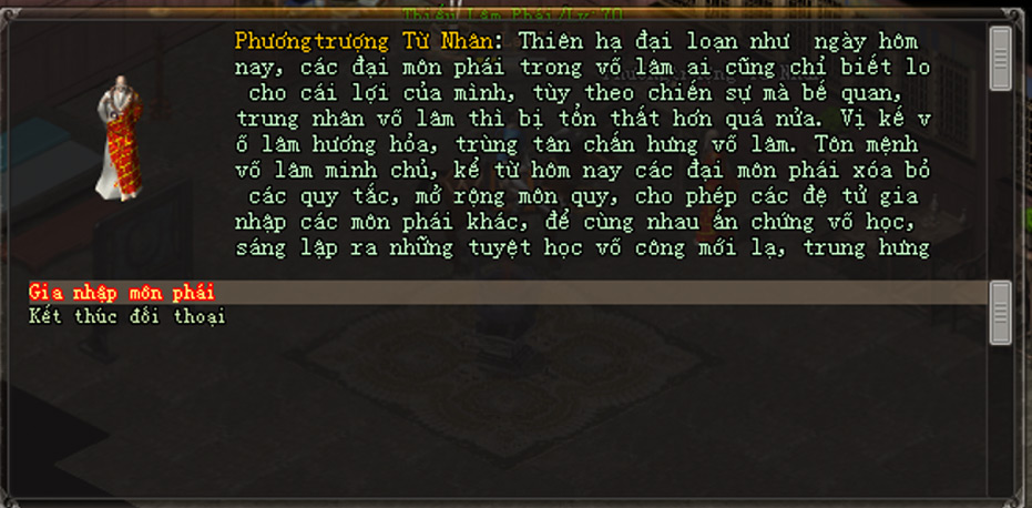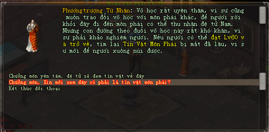 - Tiếp theo, nhân vật đến gặp NPC Môn Phái mới muốn gia nhập, đối thoại và chọn lần lượt các dòng: