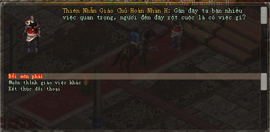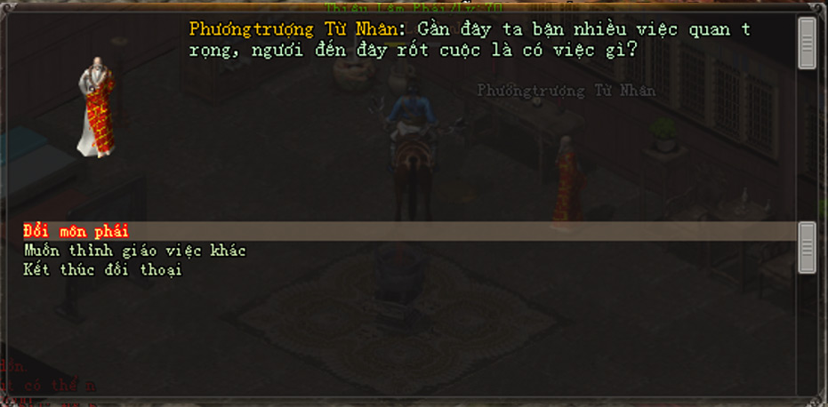 - Đến gặp NPC Chưởng Môn của môn phái hiện tại, chọn lần lượt các dòng chọn: