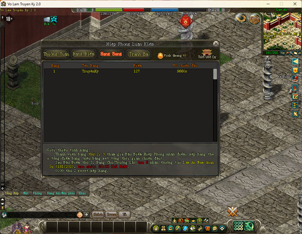 - Phần thưởng xếp hạng điểm Hiệp Phong Luận Kiếm của Bang: Thưởng xếp hạng điểm tích lũy Bang chỉ có Bang Chủ/Trưởng Lão mới có thể nhận.